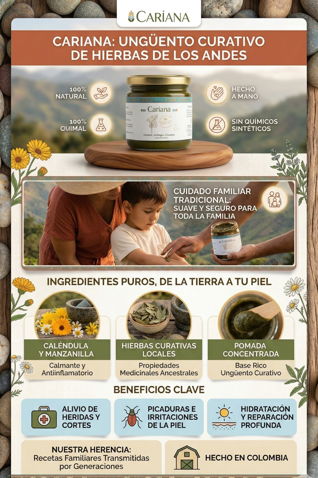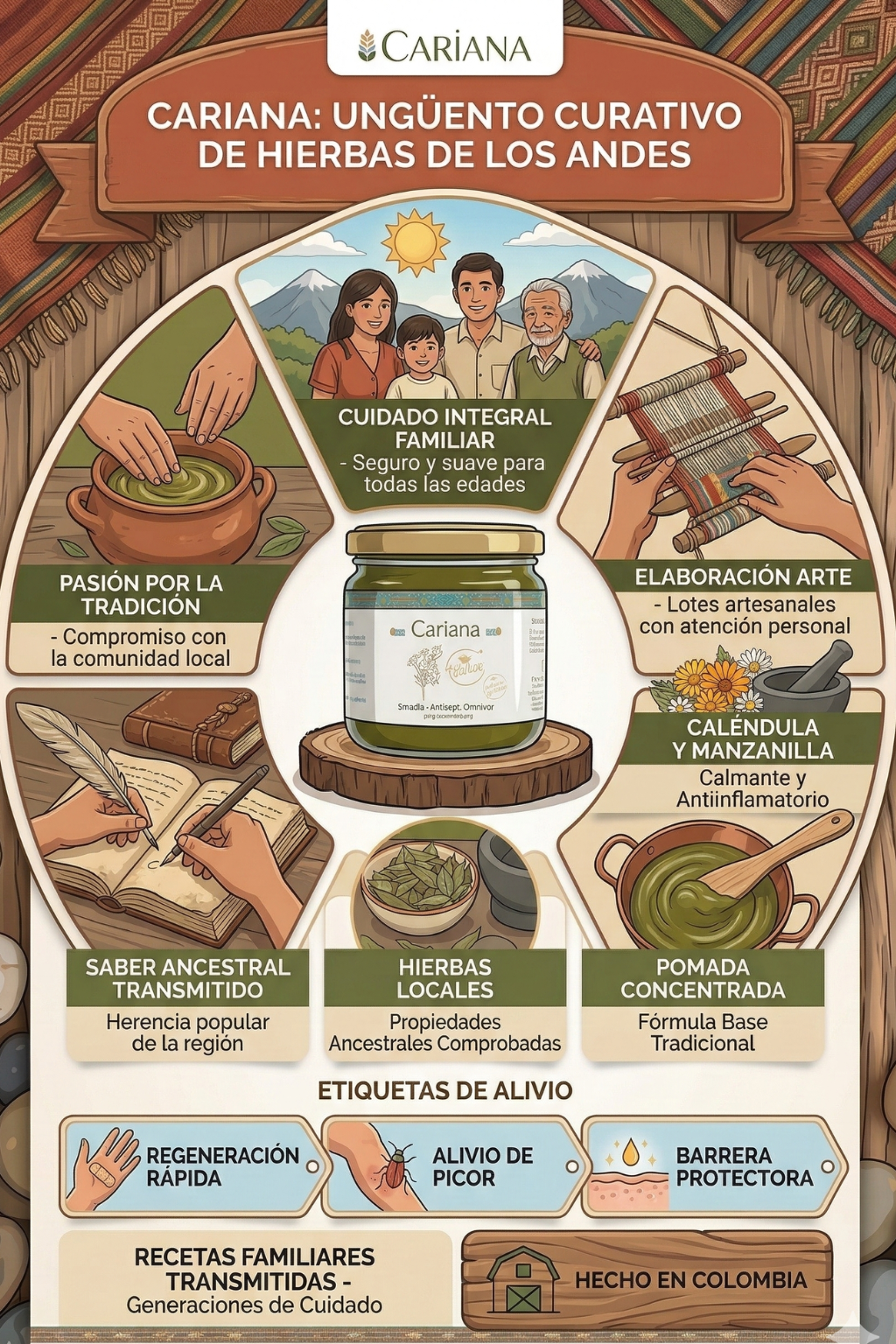 El Ungüento de Cariaña es un producto natural utilizado principalmente para el cuidado intensivo y curación de la piel, destacado por sus propiedades cicatrizantes y protectoras. Beneficia el tratamiento de heridas leves, irritaciones, picaduras de insectos, dermatitis y sequedad severa, ayudando a suavizar y regenerar la piel.